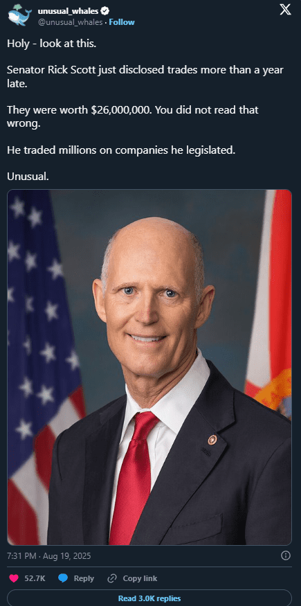 Senator Rick Scott, who recently submitted filings covering trades worth approximately $26 million, did so more than a year after the transactions took place.