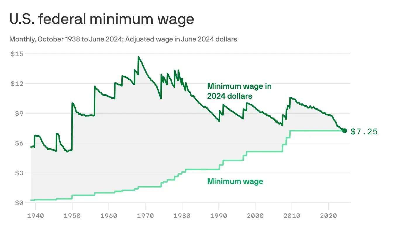 The chart below shows the inflation-adjusted and non-adjusted values of the federal minimum wage from 1938 to 2024. The minimum wage’s real value has declined significantly, which is a strong indicator that $7.25/hour is not a livable wage. Meanwhile, members of Congress make $174,000 per year.