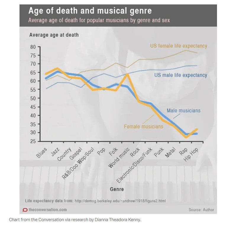Still, without looking at the age and instead the artist’s impact on a worldwide scale based on talent and influence, the legend of the 27 Club will live on. What is quite significant is the average age of death for musicians in general versus the total population. The list below is only a fraction of musicians who died before the end of their careers.