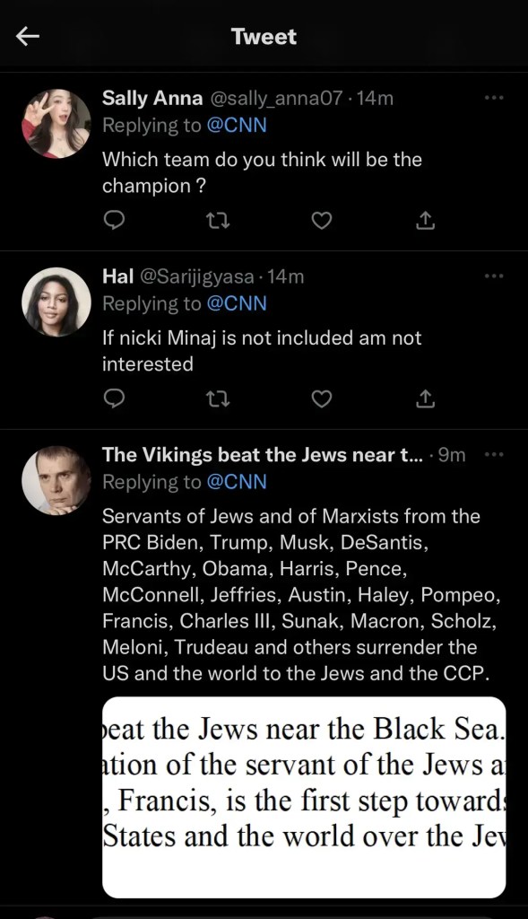 My experience today on Twitter was exactly what I was used to. Trolls commenting on posts intend to make other tweeters feel attacked and bullied. For example, this initial post had nothing to do with politics. It was about the Women’s World Cup ramping up and innocent questions about predictions on what country may win. No transgender narratives. Nothing political. But here is the tweet and comments that were added to the post.