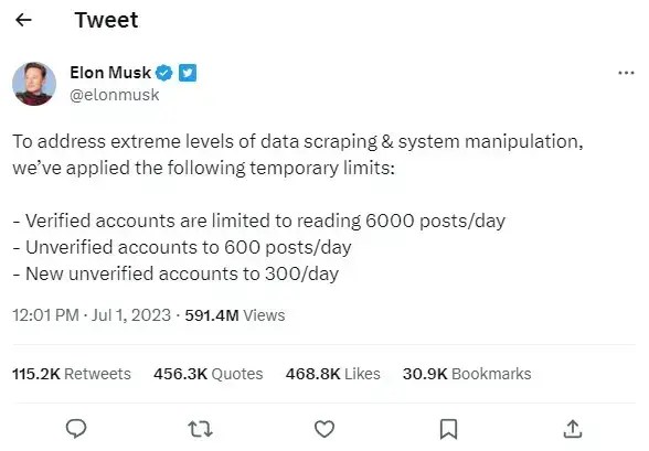 “Users cannot view tweets without logging in to the platform. Verified accounts can now read 6,000 posts per day, unverified accounts 600 posts and new un-verified accounts 300 posts. After that, users will get a message that says, ‘rate limit exceeded”‘”