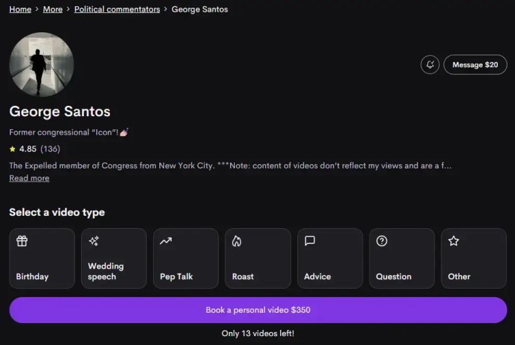The door to Congress may have closed but a very lucrative door opened for George Santos. Almost immediately, Santos joined Cameo and started making personalized video messages, successfully charging $75 – $500 per video. According to Santos, he surpassed his congressional salary of $174,000 in just a few days.