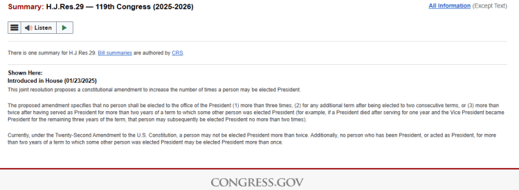 H.J.Res.29 – 119 Congress (2025-2026) “This joint resolution proposes a constitutional amendment to increase the number of times a person may be elected.” “The proposed amendment specifies that no person shall be elected to the office of the President (1) more than three times, (2) for any additional term after being elected to two consecutive terms, or (3) more than twice after having served as President for more than two years of a term to which some other person was elected President (for example, if a President died after serving for one year and the Vice President became President for the remaining three years of the term, that person may subsequently be elected President no more than two times).